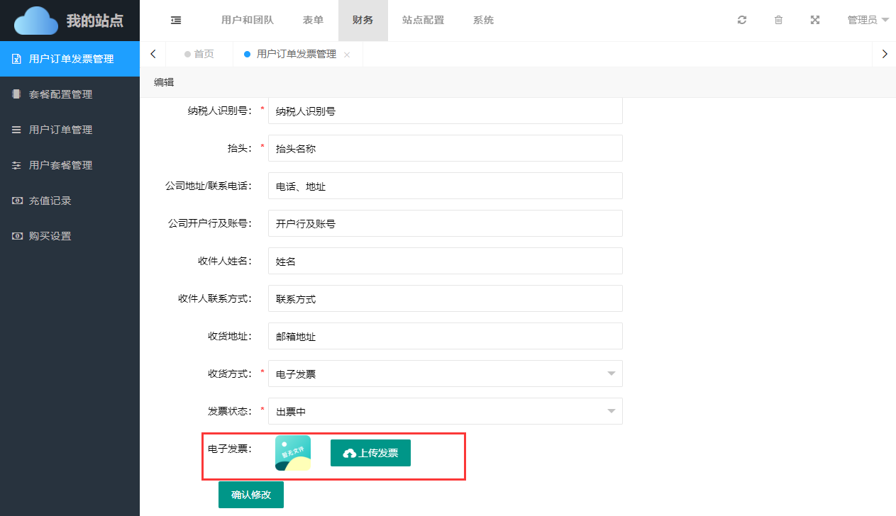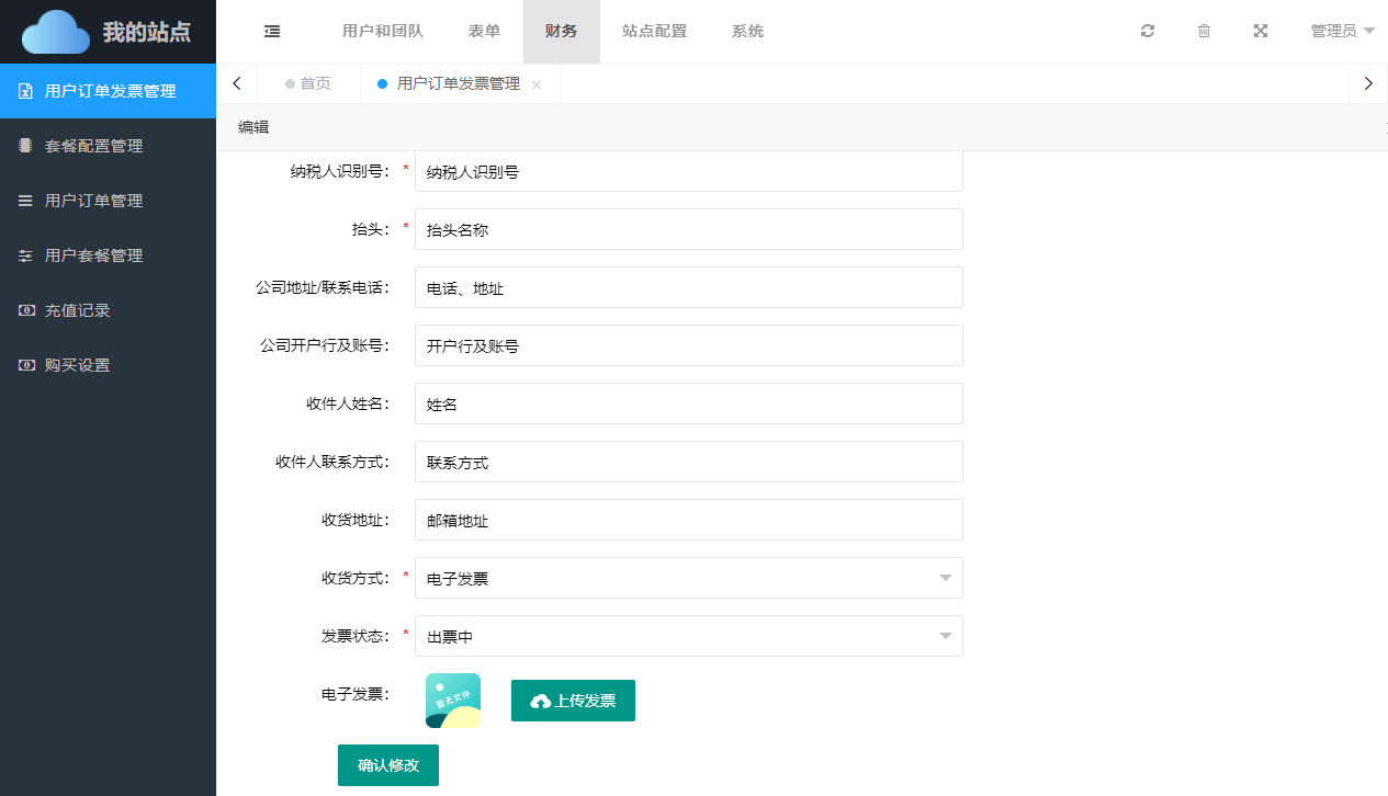 在编辑页面中,可以对用户所提出的发票申请进行查看,除发票金额外,其他信息均可修改,方便更改客户所填写错误的内容;