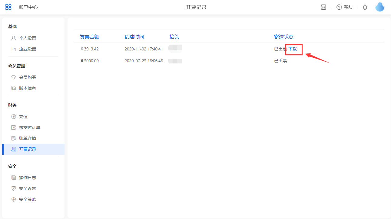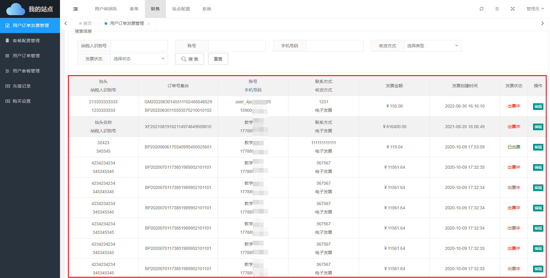 在用户购买套餐后所提交的开具发票申请,可以在后台进行处理,所有通过前台申请发票的记录,都会出现在发票列表中。