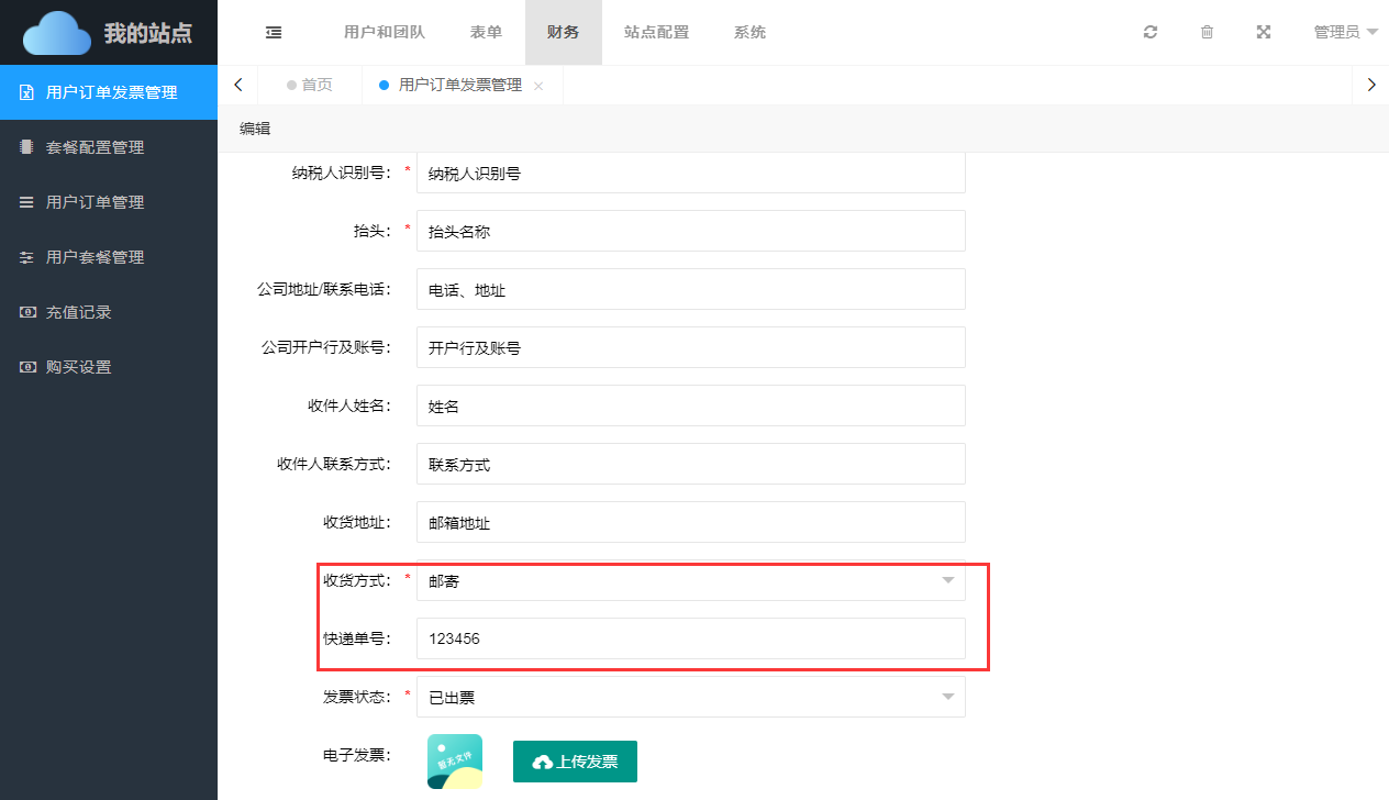 如收货方式为邮寄,在开具发票后,可填写快递单号,用户可根据快递单号查看快递状态。