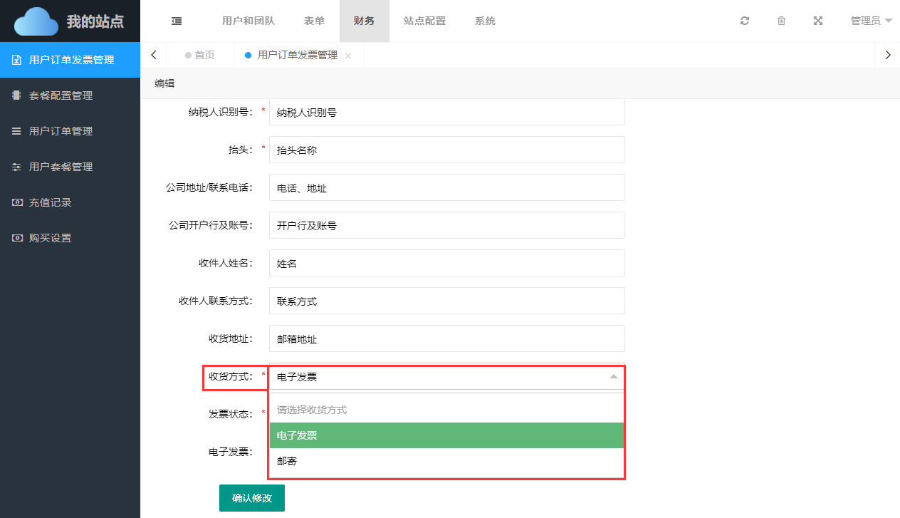 收货方式可选电子发票和邮寄两种,相关人员可在给客户处理发票后,进行状态的登记。
