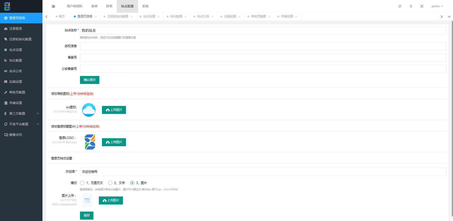 登录页信息主要设置和登录页面有关的内容,在此页面可进行站点名称、导航图标、登录页文案等和登录页有关的设置。