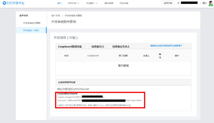 1、钉钉开放平台点击【基本信息->开发信息(旧版)】或访问:https://open-dev.dingtalk.com/v2/fe/old#/corpAuthInfo