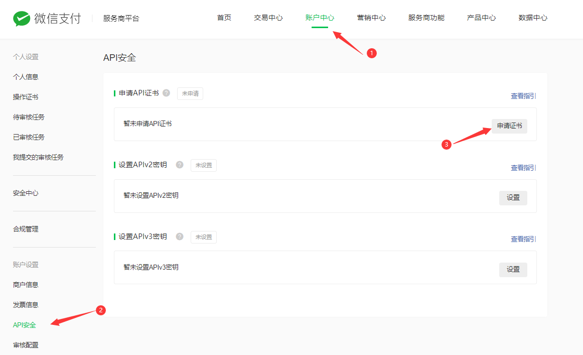 3.1、登录微信商户平台->账号中心->API安全,进行申请API证书,具体操作请自行查看旁边的指引