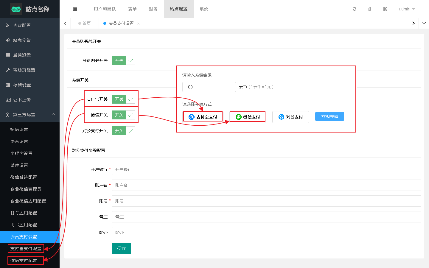 管理员可以在后台开启支付功能,开启支付功能后用户可以选择对应的付款方式进行充值。