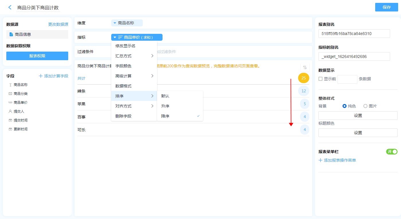 (1)在维度或者指标字段上进行排序设置。