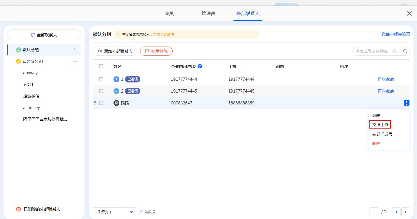 注意:当外部联系人作为子管理员时,交接工作只能交接给外部联系人。