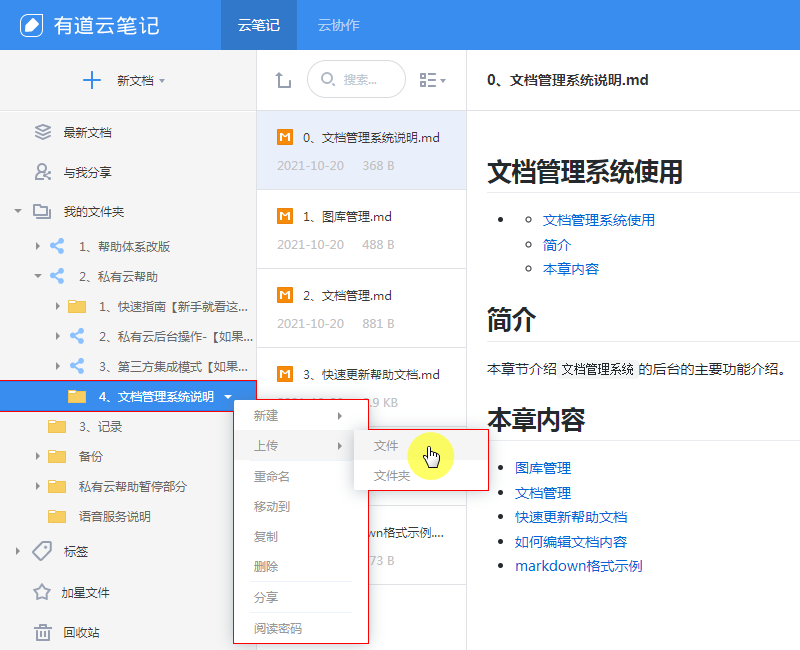 进入网页版,如图所示在我的文件夹目录下即可创建文件夹,并上传markdown文件,进行编辑预览。 - 可把编辑好的文件重新下载,再从文档帮助后台管理上传替换。(也可直接复制源文件内容,修改本地源文件进行替换操作)