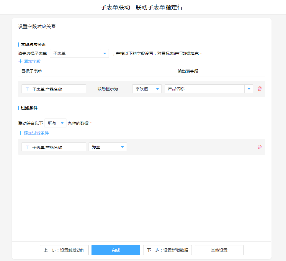 1. 添加执行动作子表单联动,操作模式选择"联动子表单当前行",设置联动对应关系。其中子表单选择需要添加数据的目标子表单,字段与过滤条件可按照实际情况进行设置。