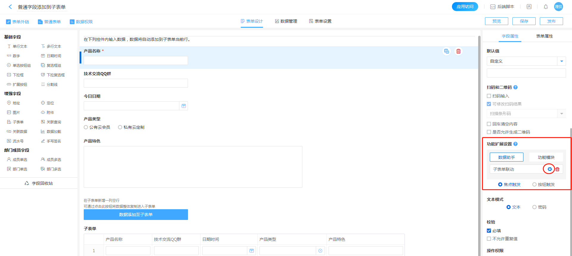 通过对控件进行数据助手配置,实现将普通字段数据填充进入子表单。
