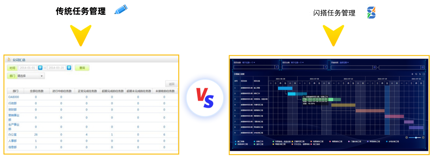 而利用闪搭的甘特图做任务管理可以将业务规划和落地执行联系起来,完成从上到下的计划分派、进度监控和从下至上的进度反馈,帮助管理者弄清项目的剩余任务,评估工作进度。