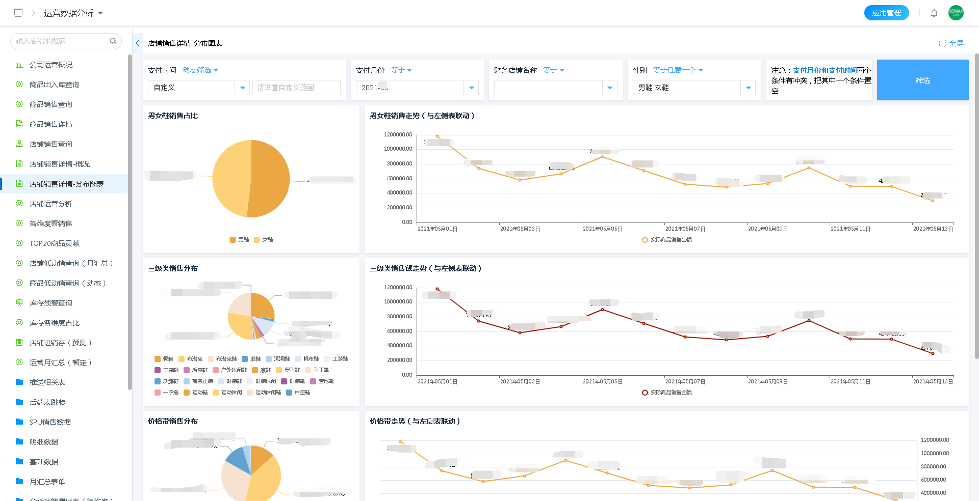 通过将销售数据转化为可视化图形报表,每个店铺的销售情况,无论是对于分类数据的汇总,还是对于销售数据的占比、趋势,都可以非常直观的展示出来。经营情况一目了然。