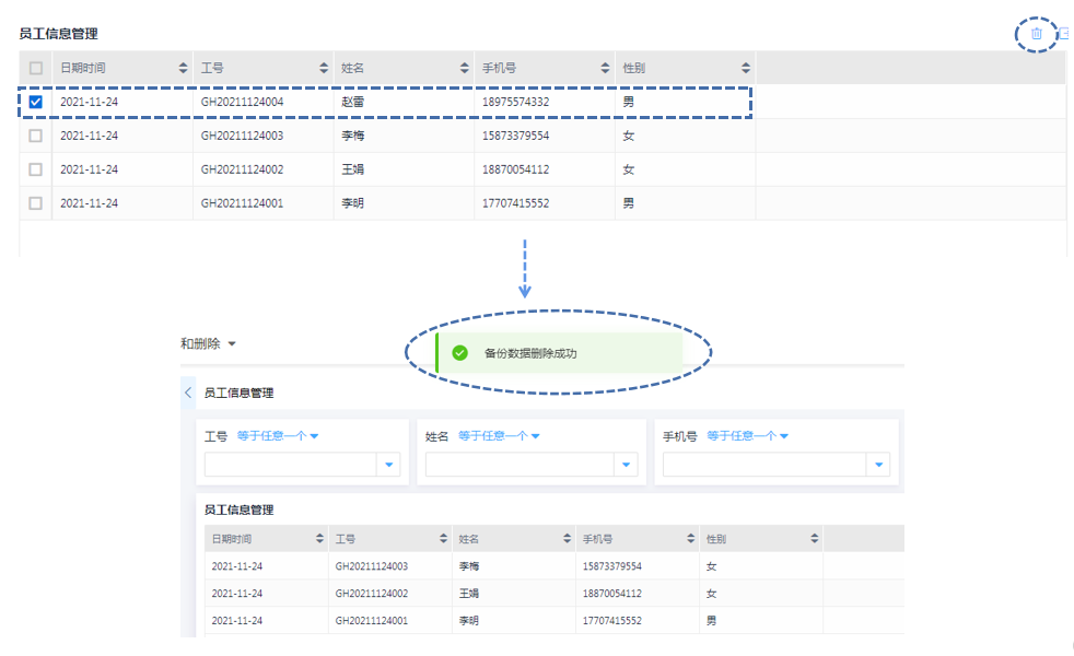 完成后端配置后,提交的员工信息将自动插入到【员工信息-备份表】进行备份,在员工信息表单中的编辑、删除等操作也将同步到备份表当中。