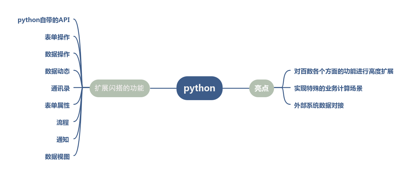 而闪搭后端体系采用的是Python脚本体系,功能拥有独立开发的能力,不需要安装复杂的软件,在原生系统的基础上可以实现多样化的功能扩展,例如表单控件、数据计算方式的升级,实现数据报表的多样化处理;python语言自带的API接口,轻松对接第三方数据平台等等;让业务处理更加自主灵活。