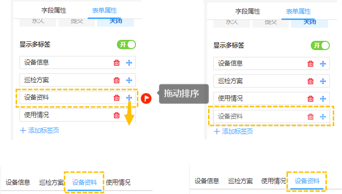 ① 在表单编辑页面>>表单属性>>显示多标签>>开启按钮后,可以对标签进行命名、添加、删除、以及排序。