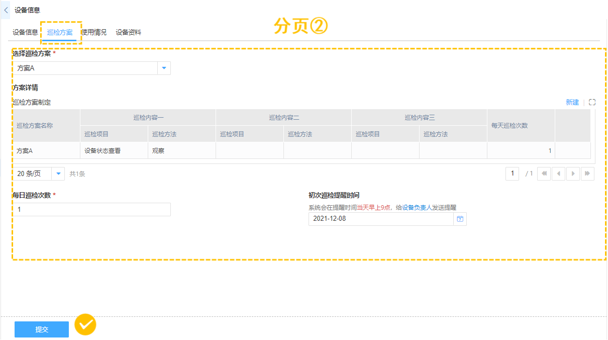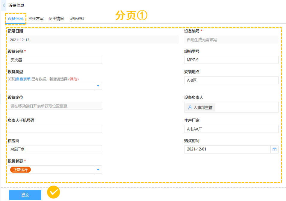 以最常见的设备管理场景举例,通过多标签显示,我们可以在设备信息中添加多个关联表单,分页查看/录入该设备的巡检方案表格、使用情况表格、设备资料等数据表格。