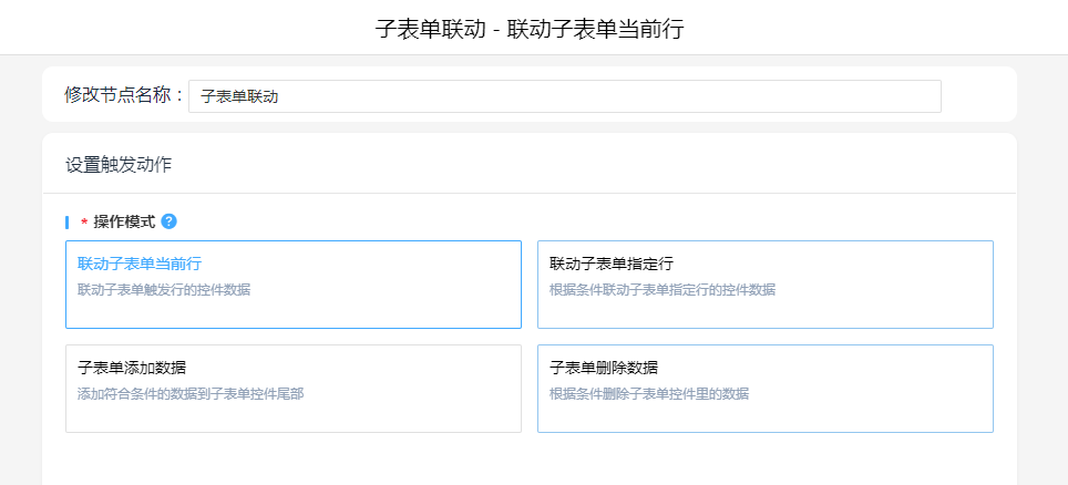 1. 添加执行动作子表单联动,操作模式选择“联动子表单当前行”,设置联动对应关系。