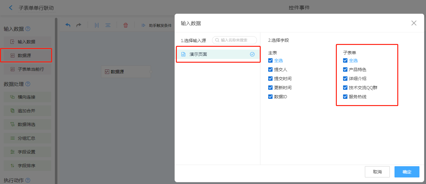 1. 输入数据选择数据源,找到需要关联的表单,选取需要关联的子表单数据