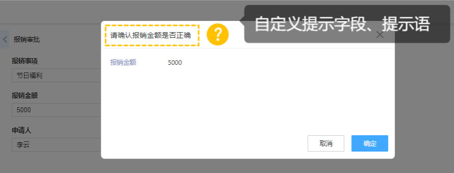 针对不同的业务场景可以自定义提示的内容,比如提前告知易误操作、提交错误内容等,让操作者主动去确认输入的重要数据无误。