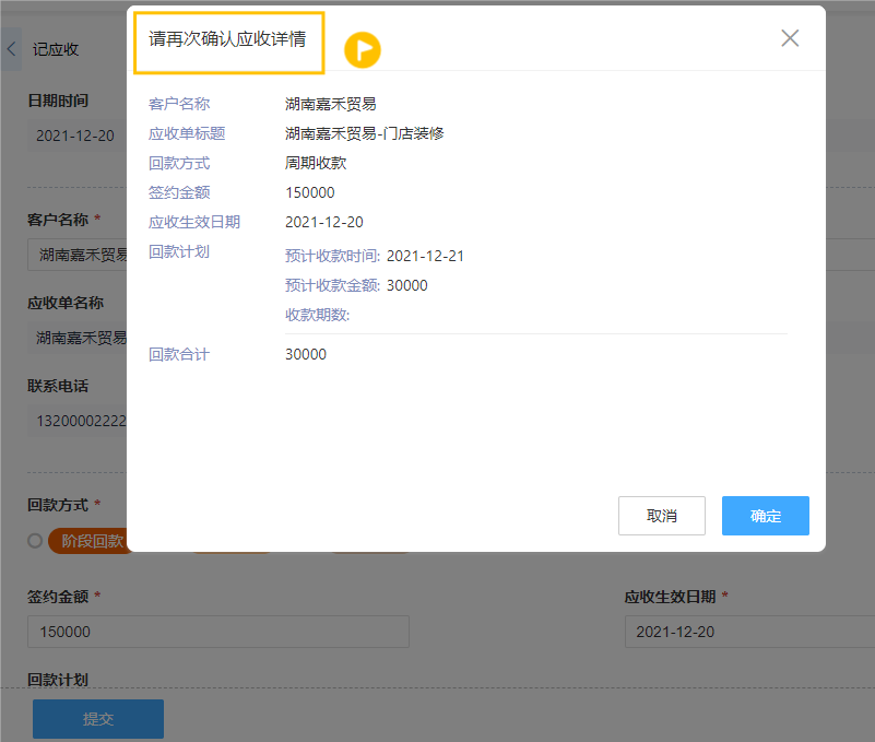 *如应收付款填写应收付详情的日期、价格核对,提交保存时候的再次确认。