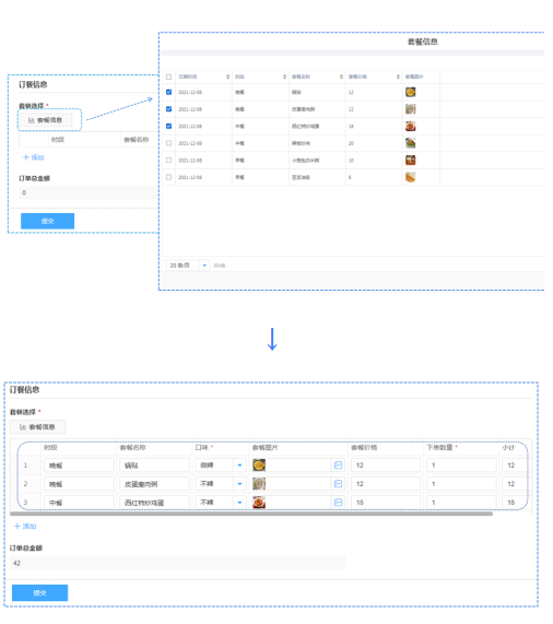 订餐系统使用数据加载功能,可以在套餐信息表单中直接勾选想要的固定套餐,节省订餐操作时间。