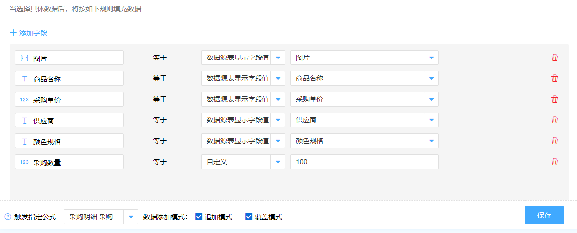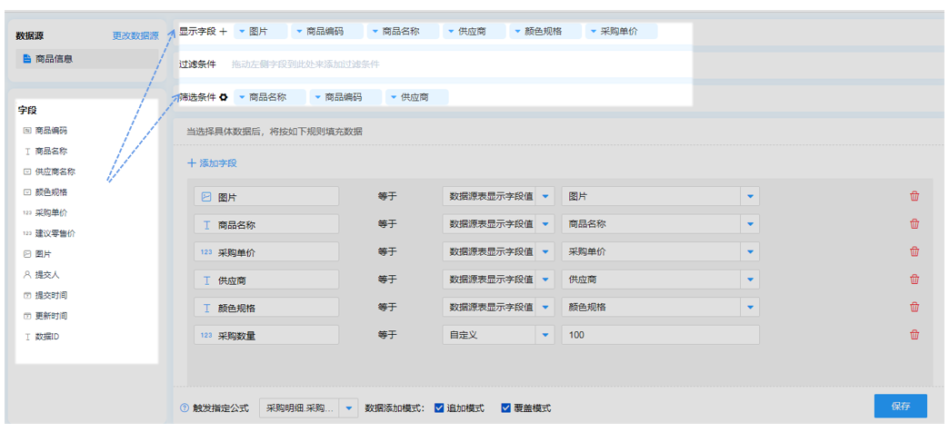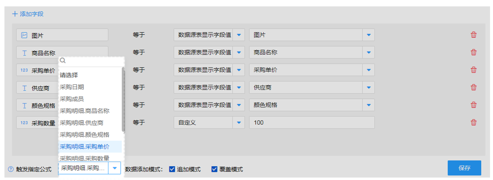 字段筛选条件设置完成后,下一步我们就可以设定规则,最终加载的数据能够按照字段进行显示都是根据规则而来。例如我们这里需要将采购表单中的图片、商品名称、单价等与数据源中的信息进行匹配,采购数量可以根据需要进行自定义设置。