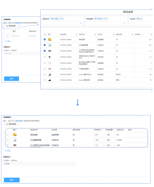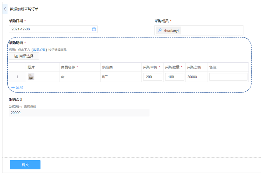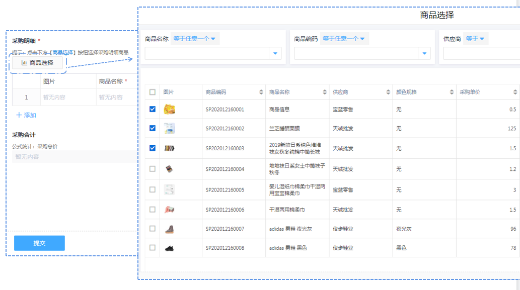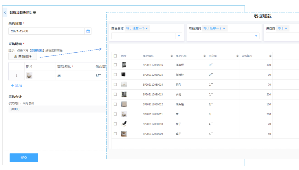 商品采购使用数据加载功能可以一键勾选商品信息到采购明细中,避免商品详情编辑出错。