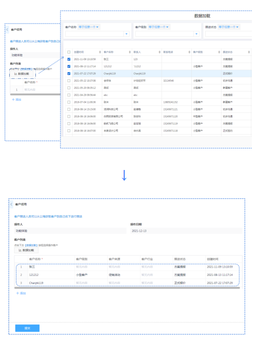 客户管理系统中,客户领用可以直接在客户列表中进行勾选,与客户相关的级别、来源等重要信息直接同步到加载列表,清晰明了。