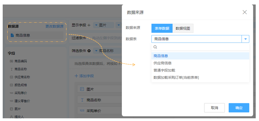 我们需要将商品信息与采购订单联动起来,因此加载的数据源我们选择【商品信息】表单,这里面有提前登记好的商品信息数据。