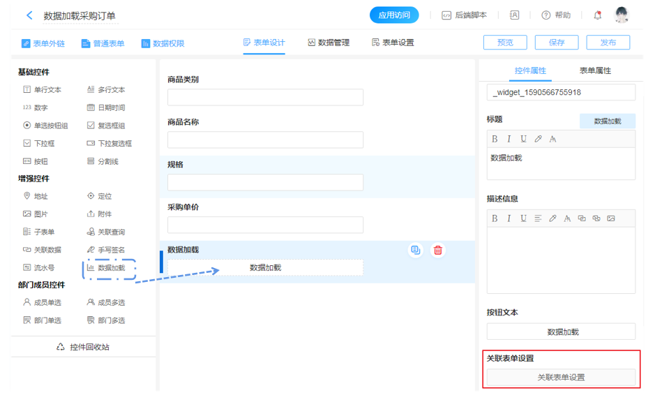 实际上,我们可以在商品采购表单中进行关联表单设置,借助数据加载功能实现商品信息数据的调用。我们在采购订单表单添加数据加载控件后,选中点击右下方的关联表单设置,我们就可以设置联动规则。
