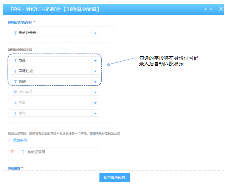 保存模块配置后,在人员信息录入表单中输入单一信息【身份证号码】后,可以快速返回设置中勾选的性别、地区、家庭住址,帮助工作人员更高效地进行人员信息的收集。
