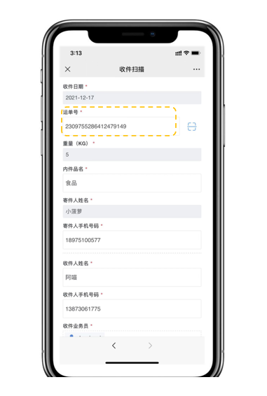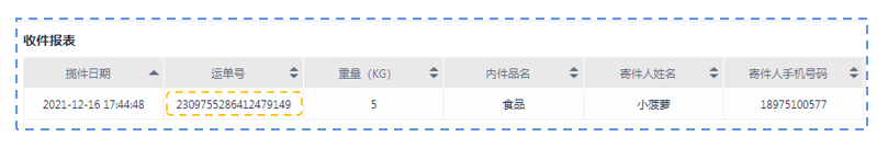 扫描完成后,运单号就会自动出现在列表中,在揽件环节登记的快递信息,也会同步传送到收件、派件、签收的表单中,能够大大节省相关工作人员的处理时间,加快包裹流动的速度。