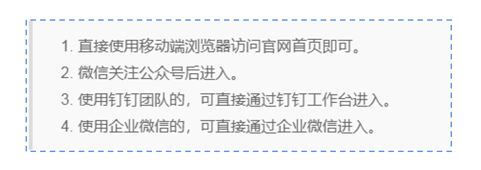 闪搭移动端的使用方法有四种,通过微信公众号、钉钉、企业微信登录的,可直接进入已绑定的账号。