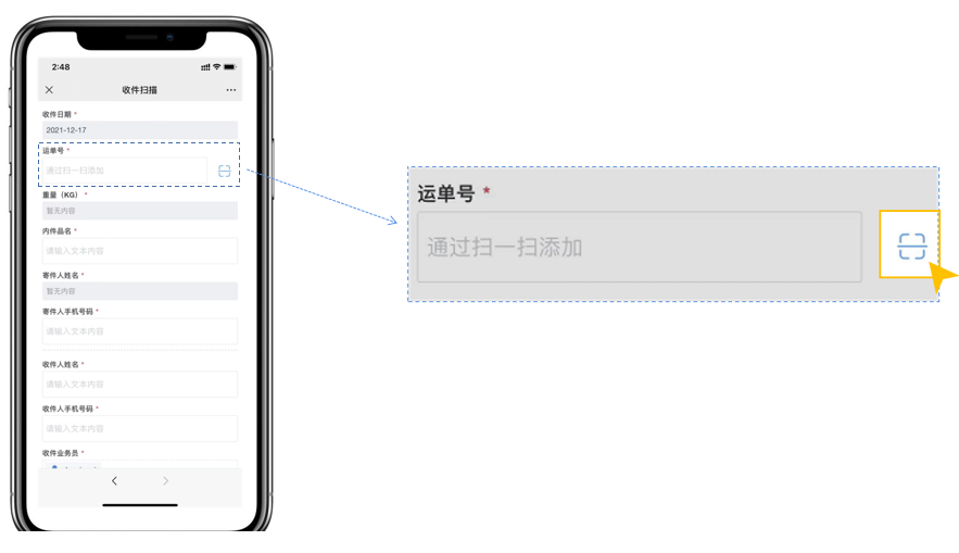 在闪搭移动端后台找到物流派件跟踪系统,进入扫描表单中就能看到运单号的右侧有扫描提示。