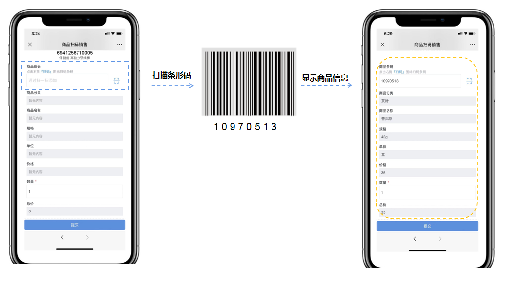 登记新增入库的商品都包含条形码,销售的时候只需要扫描商品条形码,相关信息就能自动匹配到销售表单中。