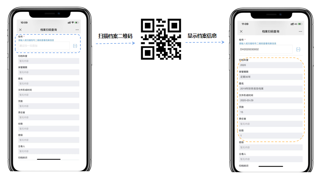 每份档案都可以生存独立的二维码,可以通过扫码显示档案相关的基础信息。