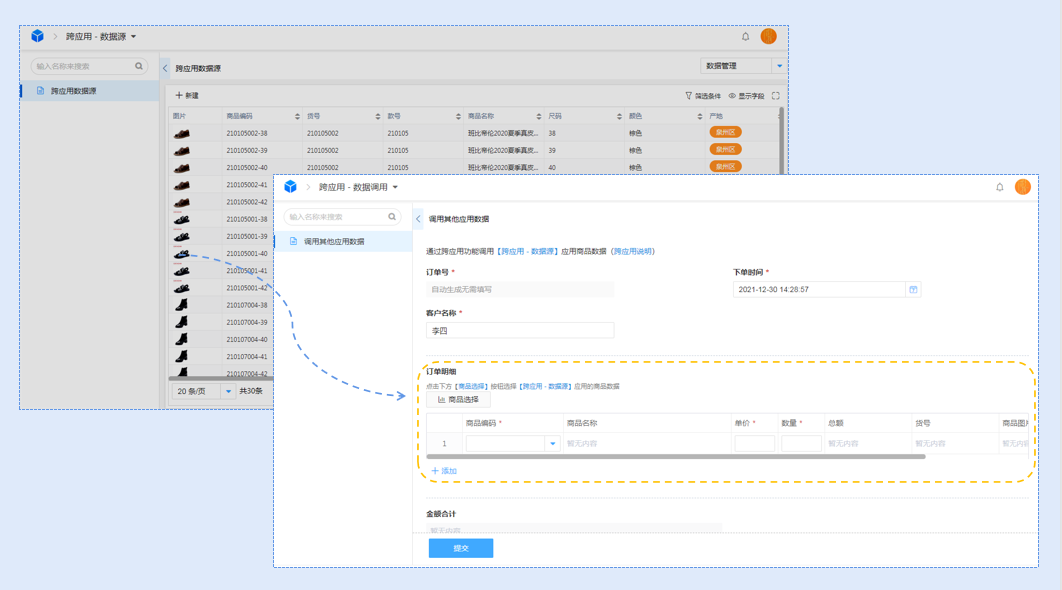 在闪搭使用跨应用功能,可以实现应用表单、报表数据之间的关联,便捷地调用其他应用中的数据。