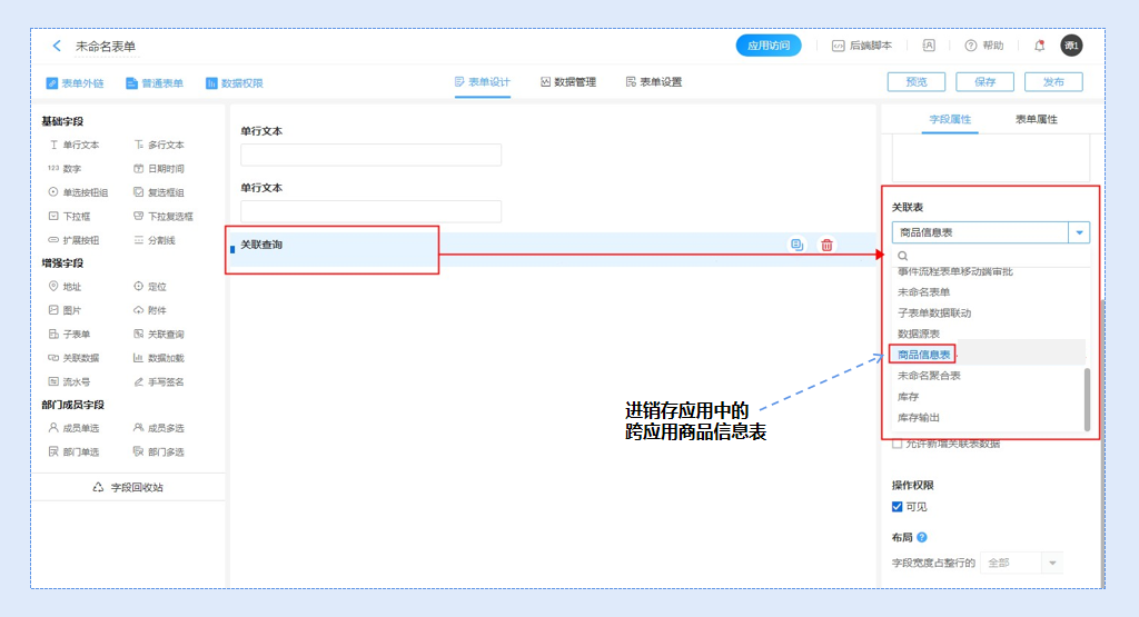 设置完成后,假设在任意应用中需要调用进销存应用中的跨应用表单,该如何操作呢?