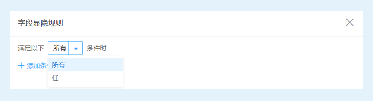 一个字段显隐规则可添加多个条件。多个条件间的逻辑关系可以是满足所有或者满足任意一个。