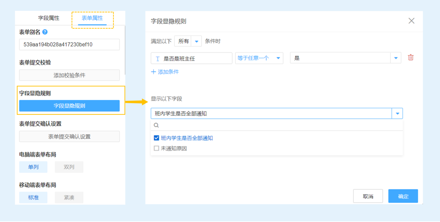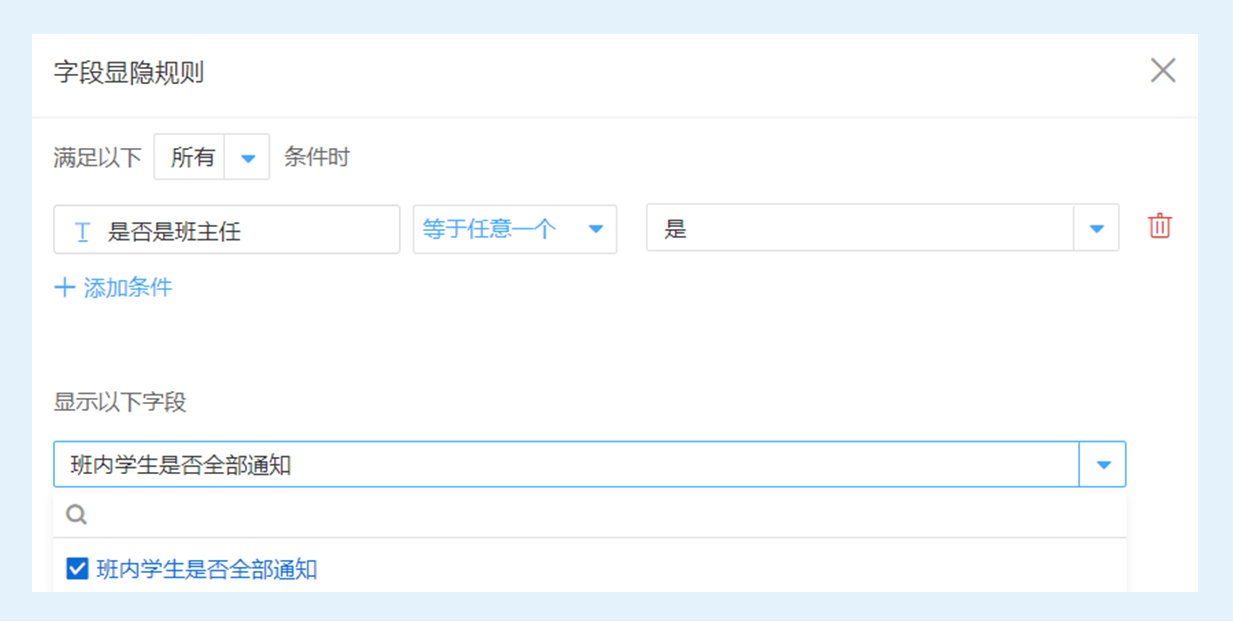 设置【字段显隐规则】后,当「身份」 等于「老师」时自动显示「是否是班主任」,且当「是否是班主任」 等于任意一个「是」时即自动显示「班内学生是否全部通知」字段。