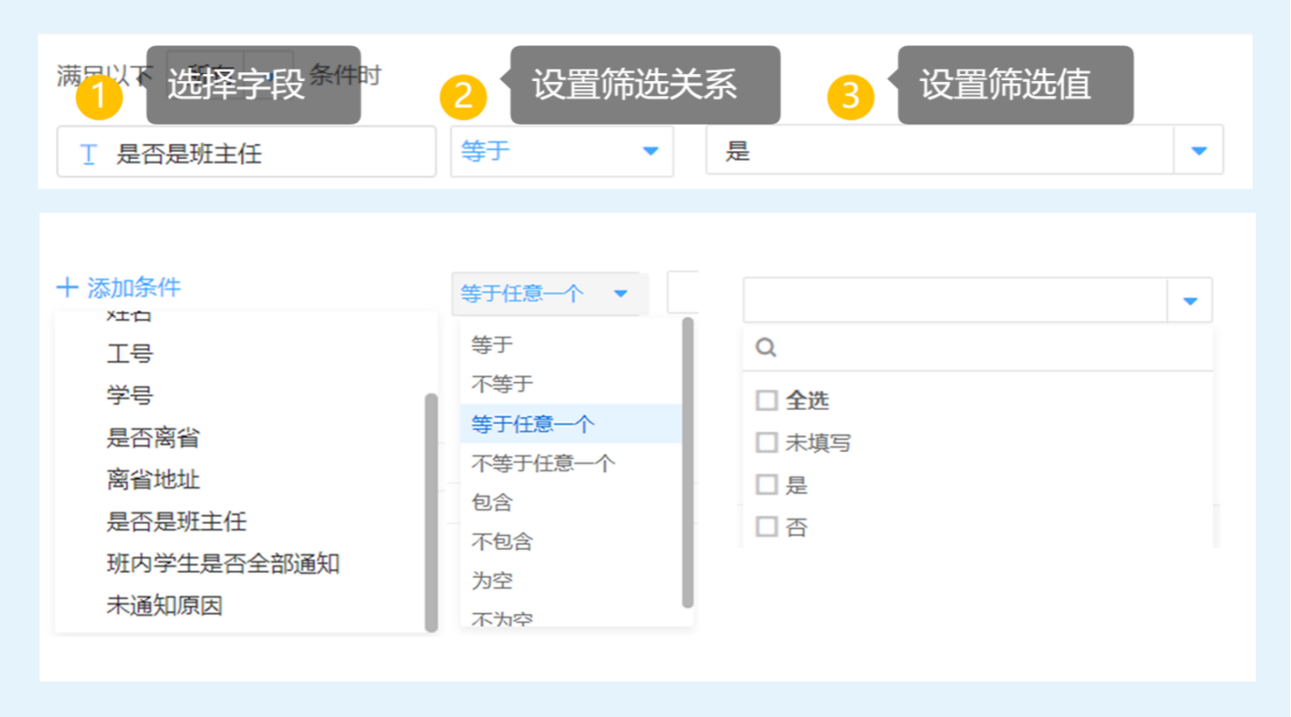 设置好条件以后,需要设置显示字段。即满足上述条件后需要显示的字段,也就是不满足条件不显示的字段。如,学校假期期间行程调查场景中,老师选择「是」班主任后,设置显示字段让老师选择是否通知了班内全部学生。