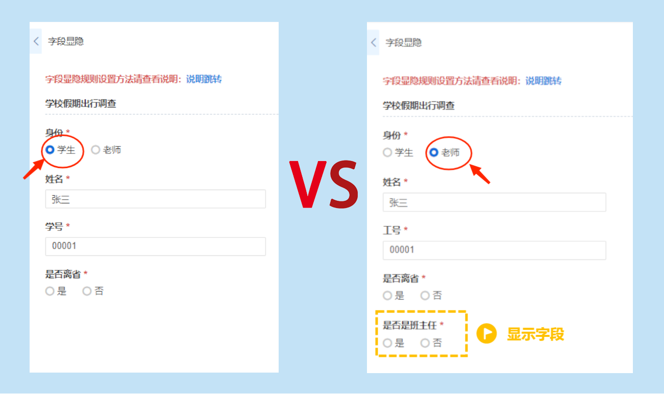 我们以学校放假安排调查场景为例,如学生需填写:「姓名」、「学号」、「是否离省」等字段;而老师除了填写:「姓名」、「工号」、「是否离省」外,还需要填写「是否是班主任」等字段。我们便可以通过字段显隐规则,设置在老师身份下显示「是否是班主任」等字段,而学生身份下隐藏。