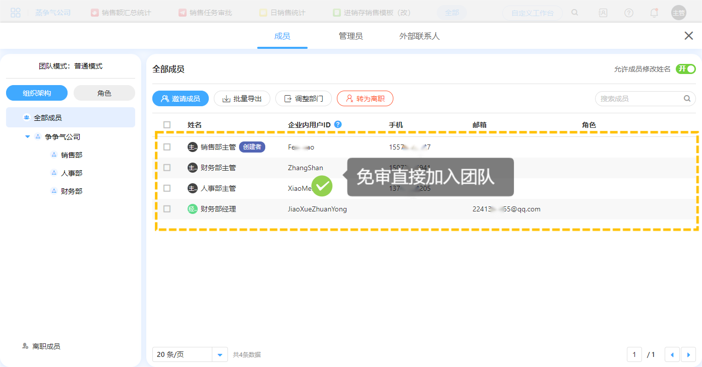 设置免审后的成员账号,在通讯录>邀请成员可以选择手动添加成员或更加快捷的批量导入成员邀请成员进入团队,无需成员在手机上再次验证操作,即可生成账号直接进入该团队。