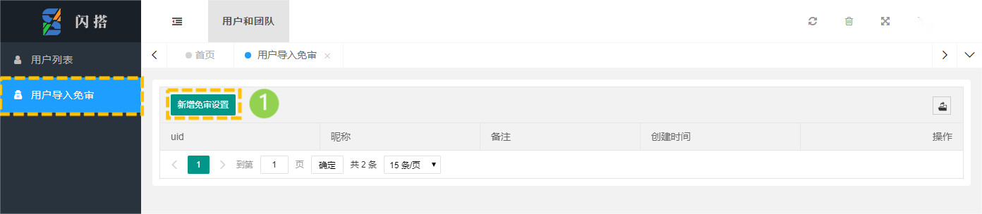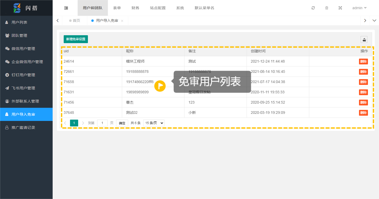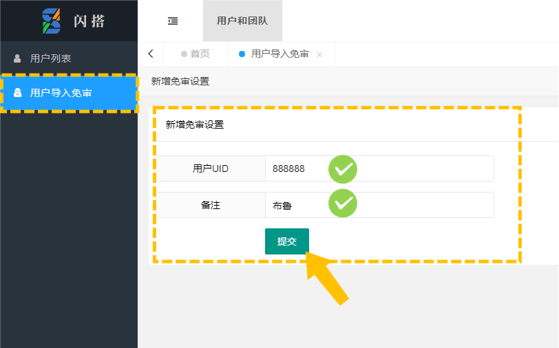 进入用户导入免审>新增免审设置后,输入免审的指定团队成员的UID及名称备注提交,即完成该账号免审设置。