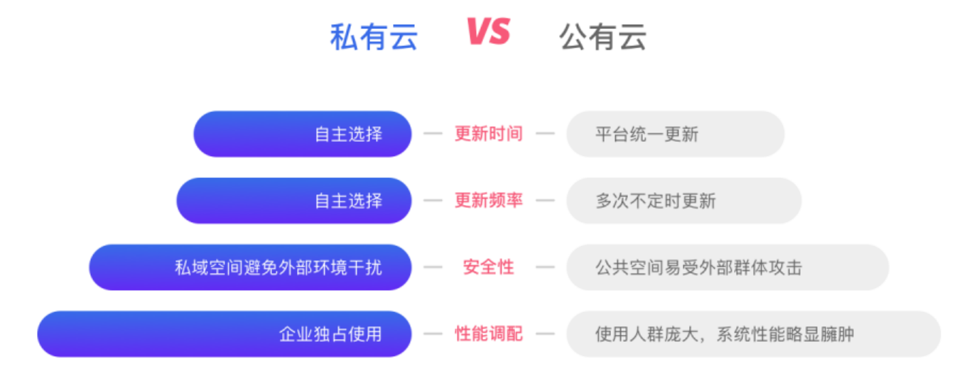 在共享的公有云空间中,所有信息都驻留在共享的平台上,安全隐患存在一定的风险。借助私有云,您的内部团队可以一手管理并完全控制所有数据和配置,保障其安全性。