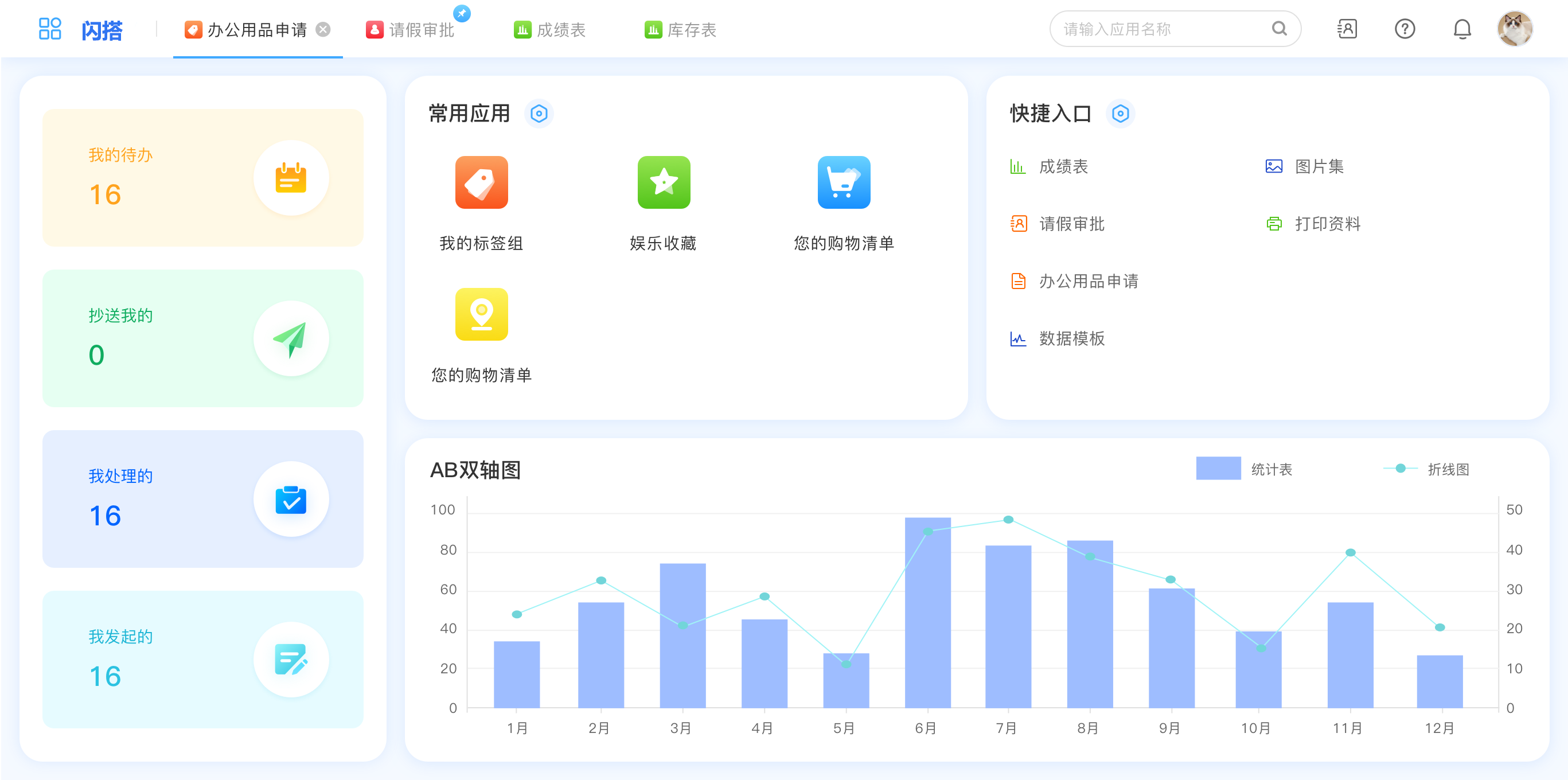 企业的工作台是员工每日都需要操作使用的窗口,更是企业传达品牌文化形象的重要门户。在闪搭,自定义的工作台设置,能够根据个人所需调整界面样式,提高视觉美感,提升工作体验度,帮助员工更便捷地处理各项事务。