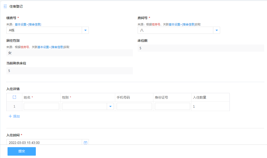 新生入校分配宿舍,通过连接宿舍信息表,在住宿登记表单可以直接安排空余的房间进行入住安排。