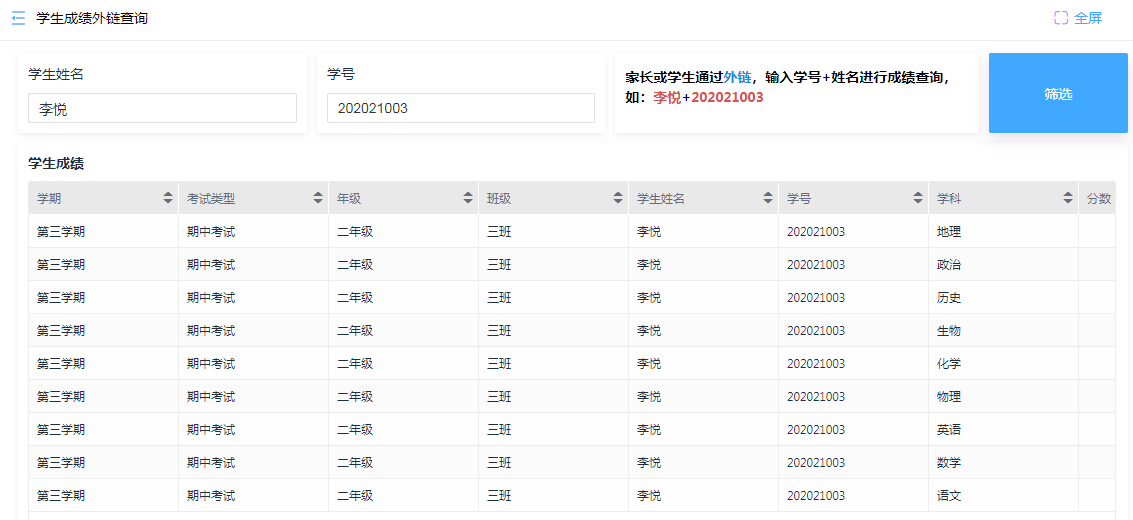 老师成绩录入完成后,可以选择将查询表单生成外链发送给学生或家长,通过填写姓名和学号即可查询自己的成绩。