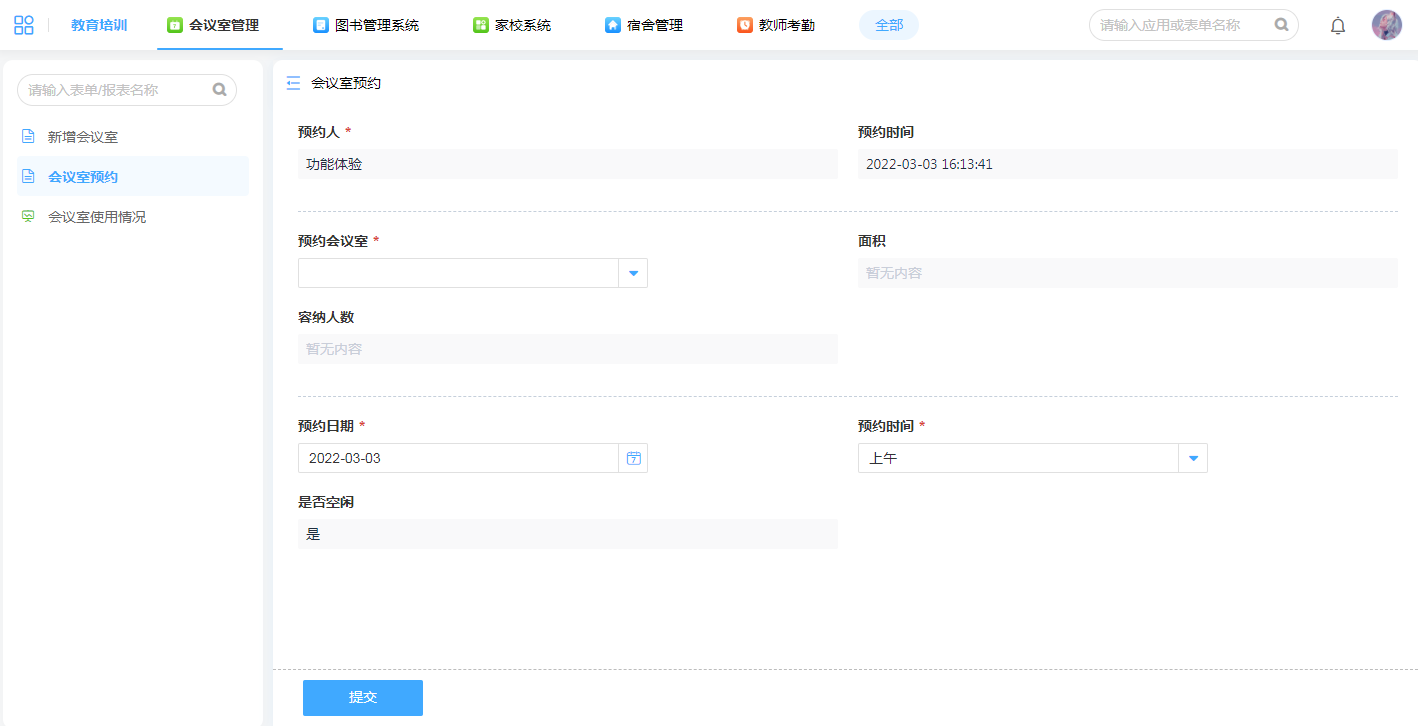 学校各年级各组经常要组织会议,会议室管理应用能够提供预约会议室、查看会议室排期等功能,节省沟通时间。