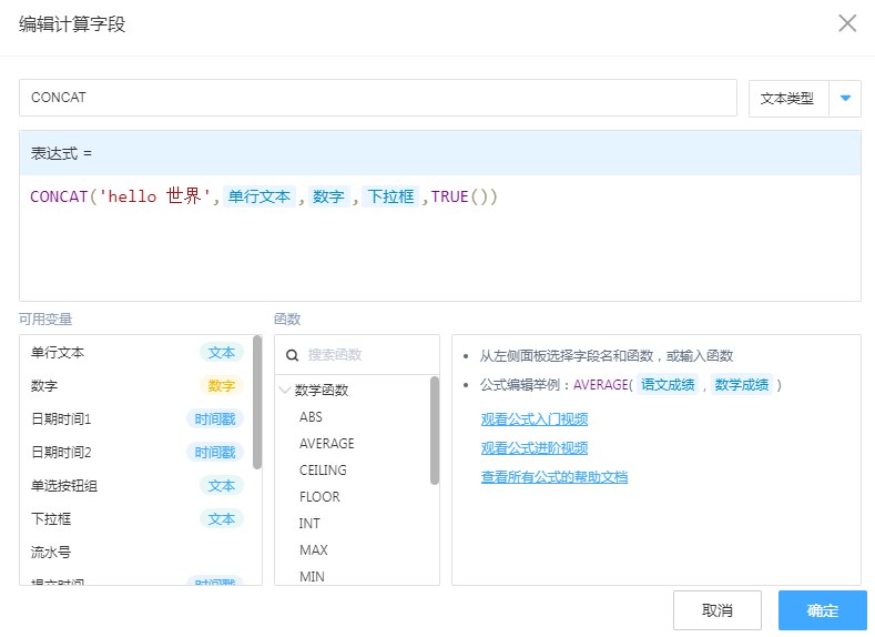- 合并:自定义常量、单行文本、数字、下拉框、公式TRUE()的计算结果