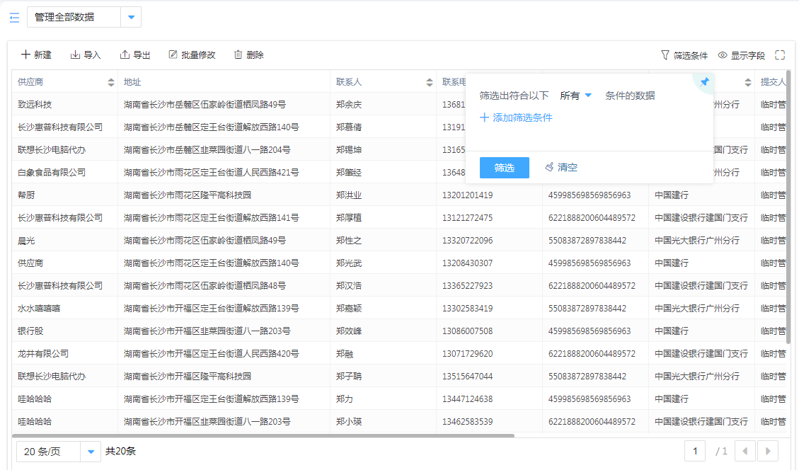 供应商管理支持外部表单导入、批量修改、条件筛选等操作,方便工作人员灵活地操作供应商列表信息。